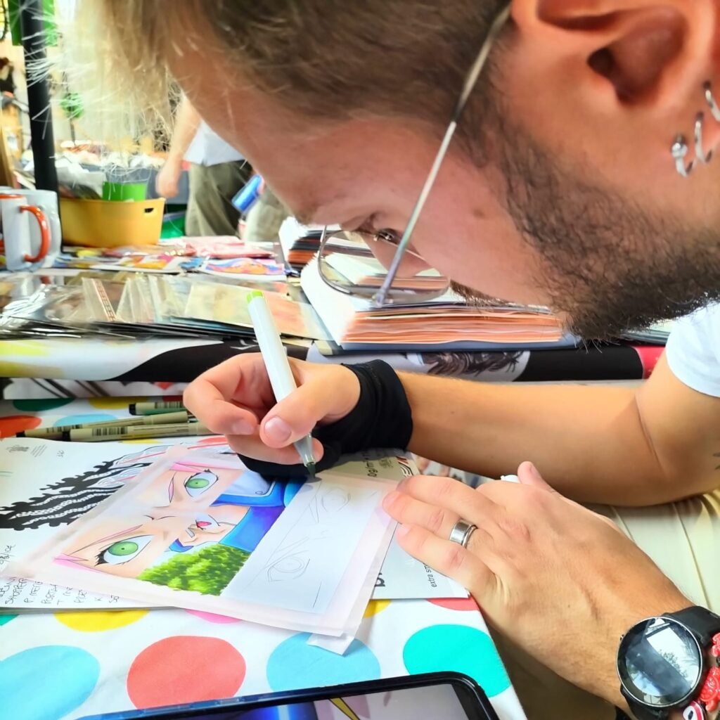Seby si occupa della parte artistica: ogni disegno viene realizzato interamente a mano, con cura e attenzione ai dettagli. I suoi lavori prendono ispirazione dal mondo manga/anime, ma possono essere adattati anche alle richieste personali di chi desidera un soggetto unico. Io, invece, mi occupo della stampa e della realizzazione finale sui prodotti, seguendo ogni fase con precisione per garantire un risultato di qualità.